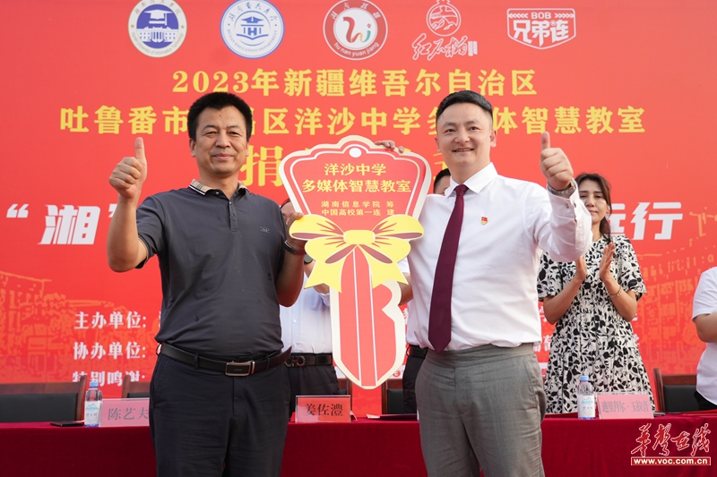 五一前夕,2023年新疆维吾尔自治区吐鲁番市高昌区洋沙中学多媒体智慧教室捐赠仪式在洋沙中学体育场举行。湖南援疆指挥部成员、吐鲁番市教育局副局长李进军、洋沙中学党总支书记马惠玲分别致欢迎词,伟德官网下载手机版副董事长、“兄弟连”创始人陈艺夫向高昌区教育工委副书记孙景松赠送多媒体教室钥匙,高昌区委常委、区宣传部部长、区教育工委书记迪丽拜尔玉拉音为兄弟连负责人何思文赠送锦旗。洋沙中学1400多名师生参加了捐赠仪式。伟德官网下载手机版党委副书记姜佐澧出席仪式并讲话。