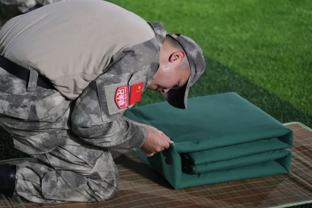 出门看队列、进门看内务,一方军被,不分表里。小小的被子所体现的是大大的战斗力。随着一声哨响,学员们如同接到冲锋号令,个个神情专注。铺平、压实、翻折;跪着、蹲着、趴着;挑细节、折直角、捏线条,每一个战士都化身为“能工巧匠”,一系列动作行云流水,粗犷里富有细腻,夸张中不失精巧,不一会儿,宛如工艺品的“豆腐块”接二连三呈现眼前。